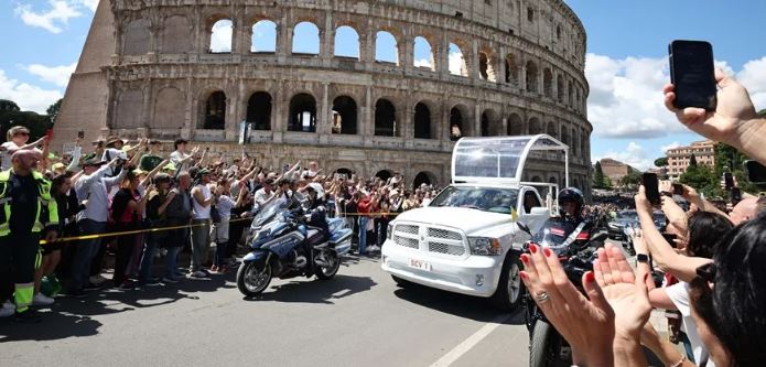 Imagen principal: El cortejo fúnebre del papa Francisco a su paso por el Coliseo en Roma. EFE/EPA/Massimo Percossi