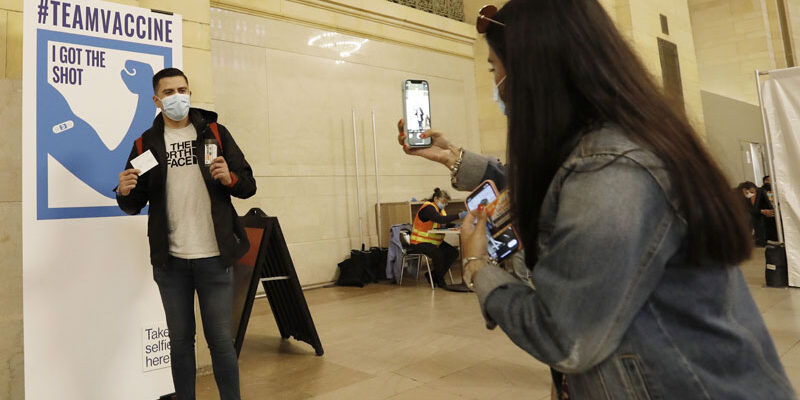 DOBLE LLAVE – Cientos de personas en la histórica estación de Grand Central, en el centro de Nueva York, van sumándose a una fila que culmina con una vacuna gratuita contra el Covid-19, entre ellos muchos turistas latinoamericanos que han acudido en un viaje exprés a ponérsela.